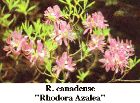R. canadense, Rhodora Azalea, is a low deciduous azalea found from Eastern Quebec to Newfoundland and Nova Scotia, and south the northern parts of Pennsylvania and New Jersey. It has showy lavender flowers.