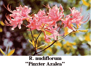 R. periclymenoides, formerly R. nudiflorum, the Pinxterbloom Azalea, is a medium deciduous azalea found from Massachusetts south to South Carolina and west to Tennessee and Ohio. It has showy pinkish-white flowers. Pinxter-flower, with lightly fragrant inch-wide blooms, is perhaps the most common and most familiar wild azalea in the eastern U.S. The name "pinxter" comes not from its coloration but from the Dutch words Pinxter blomachee, which relate to the fact that this is supposedly the azalea that blossoms on Pentecost, 50 days past Easter. We suspect this name was given by folks in northern parts of the plant's range, since in the Carolinas it is more likely to be in bloom for Easter Sunday itself.